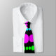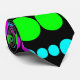 Cette cravate a un design moderne du milieu du siècle de rectangles ronds rose, vert et bleu néon, de taille croissante et décroissante, fonctionnant verticalement sur un champ de noir.