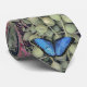 Cravate décorative dans les tons bleu, rose et vert. Papillons Bleu Morpho contre un arrière - plan de succulents.