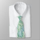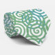 Cette cravate a un design Boho de spirales se chevauchant en bleu et vert sur un champ de blanc.