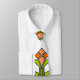 Cette cravate a un design art déco fait de diamants, triangles et polygones qui fabriquent des tulipes en orange et violet avec des tiges vertes et des feuilles.