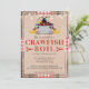 This rustic style design features a wood background with red and white ribbon. On top of that is a burlap texture with a cartoon illustrated crawfish. The red and black serif and handwritten script font is all customizable to your event, whether it is a crawfish boil, lobster, seafood, or fish boil. Celebrate your reunion, engagement, birthday, graduation, or any event is style!