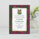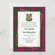Scottish clan Crawford wedding invitation done in the classic mauve, white and green tartan plaid pattern, with a gold tone edged decorative white text area. Graphics of a two unicorn heads with a thistle between them, decorates the top of the invitation. Personalize the custom text to suit your highland themed wedding.
