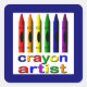 A graphic illustration of crayons with refrigerator magnet style text that reads “Crayon Artist” by artist/designer Charmaine Paulson on a variety of products.
