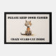 Please keep door closed. Crazy guard cat inside." Cautions guests not to let pet outside,