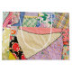 A crazy quilt composed of various patterned fabrics arranged in an eclectic mix with zig-zag stitching