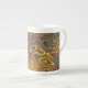 A cool Bone China Mug, with an abstract pattern of crazy swirls in shades of dark, blue, dark green and brown with golden yellow highlights.