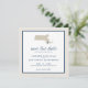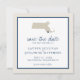 Save the Date Wedding Announcement for your Massachusetts wedding. Map of Massachusetts. Colours are in a thin Cream and Sand with a and Dark Blue outer border with a blue coloured heart over the New Bedford location. The heart is movable in case you need a different location. For enquiries about custom design changes by the independent designer please email paula@labellarue.com BEFORE you customize or place an order.