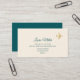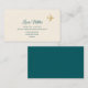 An elegant businesscard for a travel agent... with script name and small faux gold (ochre colour) airplane, printed on cream background at front side... plain dark teal colour at back side.