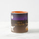 Destei's original cartoon illustration of a cute English cream coat colour Golden Retriever breed dog in a spooky Halloween scene. There goes a path towards a haunted house that is placed on a hill behind the dog. Next to the dog there are two orange carved pumpkins. There are also some creepy trees, a crooked fence and the moon with some bats. There is also a personalizable text area that now reads: "Happy Halloween!".