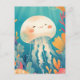 This heartwarming design features an incredibly sweet and round cream-colored jellyfish shown swimming joyfully through a vibrant underwater paradise. The jellyfish has a soft, textured bell with a blissfully happy face, closed eyes, and bright orange rosy cheeks. Its long, wavy white tentacles flow gracefully through the crystal-clear teal and turquoise water. The character is surrounded by a lush garden of stylized pink, orange, and yellow coral reefs at the bottom of the frame. Beams of bright golden sunlight filter down from the surface, illuminating the scene and creating a cheerful, magical atmosphere. The overall aesthetic is bright, cozy, and full of wonder, making it an irresistible choice for fans of marine life and playful ocean art. This cheerful jellyfish postcard is a wonderful choice for sending a warm "thinking of you" note or a sun-drenched greeting to a friend who finds joy in the colorful magic of the sea. You might choose to use this artistic card for an under-the-sea themed birthday invitation or as a sweet way to share news of a summer beach trip with your family. It also makes a precious decorative piece for a child's nursery wall or a bright addition to a creative scrapbooking project as a small token of aquatic happiness. This versatile design is also an excellent choice for a holiday thank you note, a graduation message, or as a heartwarming way to share a message of joy for any situation or event.