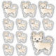 Destei's original cartoon illustration of a cream long coat Chihuahua breed dog. The design is placed 12 times on the sheet in three different sizes. There is one bigger dog, three medium size dogs and eight small size dogs.