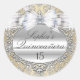 Quinceanera Sticker. Cream damask & silver jewel bow. Exclusive Zazzle. Customize with your own details. PLEASE NOTE all flat images! They Do NOT have real silver, bows, Diamonds or Jewels!!