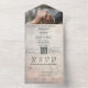 Introducing our elegant and chic wedding invitation in a rustic weathered whitewash style texture background with rust coloured accents and dark chocolate brown, almost black lettering. At the top of the invitation you can customize with a personalized photo that will have a weathered texture transparent overlay so it blends seamlessly with the weathered background of this invitation. This trendy and minimalist design is perfect for couples seeking a vintage and elegant look for their special day. The highlight of this invitation is the convenient QR code, allowing guests to RSVP effortlessly using their smartphones. For traditionalists, we've included a traditional paper RSVP option as well. With the all-in-one design, guests can easily tear away the RSVP section and send it back. Additionally, we've provided email information for RSVPs, ensuring a seamless and convenient RSVP process. Fully customizable, this invitation also offers the option to add a cherished photo, adding a personal touch to your wedding announcement. Create a memorable and stylish impression with our customizable wedding invitation featuring a vintage style, weathered background in a cream and rust colour scheme, complemented by the rich texture of dark brown lettering.