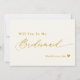 The card prominently features the phrase "Will You Be My Bridesmaid," often presented in a flowing script font that adds a touch of romantic elegance. The soft creamy white yellowish background provides a serene and sophisticated backdrop, allowing the shiny shimmer gold script to stand out. The card is often personalized with the bride's name, adding a special touch. The inside of the card is typically left blank, allowing for a handwritten message that expresses the bride's personal connection and excitement. The overall design is intended to be visually appealing and cohesive with a modern or elegant wedding theme.