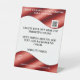 The top and bottom edge of this desktop stand have a Burgundy maroon red wave banner set against a background colour of your choice and templates in black and white for your personalized wording. You can add photos, logos, art work and your choice of font sizes, styles and colours. Move things around and make it unique. Available in different sizes.