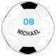 Create your own custom, personalized, stylish black and blue typography / script on white background, monogrammed  player name and jersey number, hand stitched with care, regulation sized soccer ball / display trophy football. Simply enter the player name and jersey number, to customize. Makes a great gift for birthday, christmas, holidays, new years, and more, for your loved ones, dad, husband, groom, son, brother, granddad, grandpa, grandkids, grandson, stepson, nephew, soccer player, team, club, coach, family and friends.
