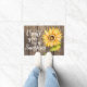 Pretty floral doormat featuring watercolor sunflower with inspirational quote. The motivational quote says "Create your own Sunshine." The background is wood texture. Rustic and country design.