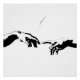 A black and white pop art style version of "The Creation of Adam" by Michelangelo. The original was painted on the ceiling of the Sistine Chapel and depicts God's creation of the first man, Adam, as told in Genesis.