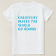 Tshirt for creatives features the text 'creativity makes the world go round' in bright blue bold typography. Exclusively designed for you by Happy Dolphin Studio. If you need any help or matching products, please contact us through our store chat!