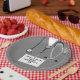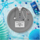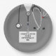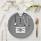 Fun medical-themed party plates featuring grey hospital scrubs design for nursing school or medical school graduation party. To personalize edit text to add name of grad.