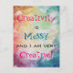 Text says creativity is messy and i am very creative. An abstract painting using thick expressive brushstrokes with a lot of motion and movement. Lots of heavy paint in blues, yellows, reds, orange and green. An artistic and creative style. An inspirational and funny quote / reminder for artistic and creative types.