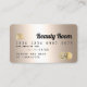 An elegant modern, stylish beauty Hair and makeup artist credit card style business card with a modern script font typography on a chic faux yellow gold metallic foil glam trendy background. all text is customizable, add your social media. Featuring faux gold stripe. Add your logo, your monogram and QR code.