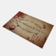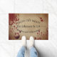 This custom doormat features a creepy horror theme. The background is a worn and dirty looking brown colour with blood stains splattered across it. Two bloody hands are pictured at the bottom. A sample butcher shop name is printed near the top which you can personalize to inlude your own custom name and text.