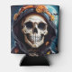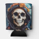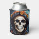 Can cooler with an illustration of a skeleton wearing a hooded jacket with an orange witch's hat on top. Surrounded by cute and spooky pumpkins. A glowing moon in the back with a single bat flying nearby. Fun autumn Halloween design.