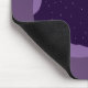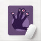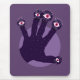 Horror mousepad with a weird digital illustration of a dark palm with fingers ending in eyeballs with pink irises and white eyelashes watching you over purple background.