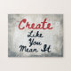 Une belle pièce typographique à thème d'art avec les mots "Créer comme vous le voulez". Il est beige et gris avec du texte noir et rouge et un accent blanc sous la citation.