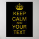 Créez votre propre affiche personnelle "Keep Calm and Carry On" ! Cette version a laiton antique / couronne or et texte sur un arrière - plan noir (couleur arrière - plan personnalisable!). Allez-y et remplissez votre propre texte dans les cases fournies, et n'hésitez pas à vous customiser comme vous le souhaitez. Idéal pour les enseignants - faites une affiche personnalisée pour votre classe ! Ou créez votre propre slogan personnel pour le bureau ou juste votre bureau. Amusez-vous et amusez-vous !