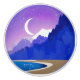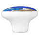 Ceramic knob in a circular illustration of a crescent moon, lake shore, hills and mountain range, in shades of deep blue and violet