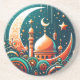 An enchanting illustration of a majestic mosque gracefully resting atop a glowing crescent moon. The mosque radiates a serene and divine aura, with intricate domes and minarets illuminated against a starry night sky. The crescent moon cradles the mosque like a celestial throne, symbolizing peace, faith, and spiritual elevation. A breathtaking fusion of Islamic art and cosmic beauty, evoking a sense of wonder and tranquillity