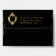 An elegant black and gold envelope with a monogram initial in a vintage crest on all sides, recommended for a black and gold wedding invitation. It is black outside and faux gold foil inside. The vintage crest is also faux gold foil. The return address is printed on the flap, in golden caps, with the monogram in crest on its left. The monogram is formed by the 2 initials of the bride and groom, separated by a line.
