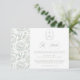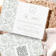 Sage Green Monogram Crest Wedding Details card: Vintage-inspired line art monogram crest with elegant sage green typography. Features a chinoiserie floral pattern for timeless sophistication. Elegant script font for a formal and classic style. Add your own webside with a custom QR code on the reverse or simply delete it for a more traditional card.
