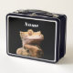 This is a standard metal lunchbox that appears to work just fine. We designed this box ourselves with an uploaded photo and custom text on the front and back. It looks absolutely beautiful except the front of the lunchbox is not centered like it shows in the photo. The print borders don't align with the inset flat part of the box where the preview photo online showed it perfectly centered in there. The back looks nice and centered though.