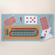 Whether you're playing your own game of beach cribbage or just soaking up some rays, you'll love this beach towel that's perfect for cribbage players. It features an illustration of a cribbage game board in tan, red, white and blue as well as illustrations of playing cards and game pegs set against a light blue background.