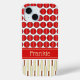 Cricket balls create a bright polka dot pattern on a white background on this sporty phone case. Cricket bats are also used in a complementary pattern. A red band across the case has space to add a name or other text to personalize.