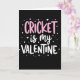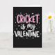 This card features a deep black background with the message “CRICKET is my VALENTINE” centered in three lines, creating a sleek, high-contrast look. “CRICKET” sits on the top line in rounded bubblegum pink letters that feel like an excited shout of affection 🥰. Just below it, “is my” appears in thin white cursive lettering, adding a softer, closer-to-the-heart touch. “VALENTINE” anchors the bottom line in strong white letters that mirror the top word’s shape and weight, making the whole layout feel balanced ❤️. Around the text, small white dots are sprinkled like confetti, giving the scene a celebratory sparkle without crowding the message. Tiny white hearts float among the dots, hinting at a sweet connection between sports pride and romance through the way they cluster near the words. The decorations stay light and airy, with the hearts and dots most noticeable near the upper and side edges of the centered text.