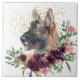 A beautiful portrait of a German Shepherd Dog emerges from a crimson red and pink bouquet on this decorative tile. Behind the dog image is a spray of gold confetti. Everything is placed on a white background.