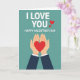 This card shows two stylized hands with soft shading and a gentle upward curve, holding a large crimson heart as if offering it with care 🥰❤️. The hands sit centered on a cool teal background, and the warm red heart stands out strongly against it. Above the heart, the words “I LOVE YOU” appear in white sans-serif letters, with two small red hearts nearby that echo the main heart and add a sweet, flirty touch. Below the hands, “HAPPY VALENTINE’S DAY” is set in the same white type, placed near the bottom to balance the layout. The simple shapes and tidy symmetry give the scene a modern look, while the cradling gesture suggests closeness and trust between two people. Dark blue suit sleeves frame the wrists, and small white cuffs peek out, hinting at a dressed-up moment of giving. The teal field stays flat and smooth behind everything, making the red heart, white lettering, and tiny red heart icons easy to spot.