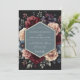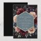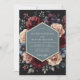 This dramatic floral design creates a moody and romantic atmosphere. Rich crimson peonies, dusty slate blue blossoms, and soft blush roses emerge from a dark, nocturnal background. Muted green foliage adds depth to the composition, evoking a sense of timeless, gothic elegance for an evening affair.