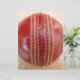 The artwork features a tightly cropped view of a red leather cricket ball. The focus is sharp on the central seam and the surrounding leather, showcasing the detailed stitching and the texture of the ball's surface. The composition is simple yet impactful, drawing the viewer's eye to the craftsmanship and the iconic nature of the object.