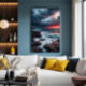 Fierce waves crash against dark rocks under a dramatic sky bathed in crimson and blue hues. A powerful piece that captures nature's wild beauty and the moment a storm meets the sunset.