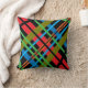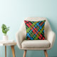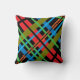 This cheerful throw pillow displays a colourful abstract pattern of crisscross lines in red, orange, green, yellow, blue and black on a black background. The image is repeated on the back.