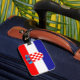 This luggage tag features the flag of Croatia with the coat of arms in the middle.