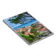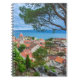 View of the small town Omis surrounded with mountains, Cetina river and sea, Makarska Riviera, Croatia. View of pine tree, old city centre with red rooftops and blue see.