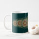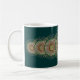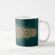 Tasse de café décorée de la conception de "croissance". La conception est entourée avec un arrière - plan bleu-vert et équilibrée avec une frontière vert-foncé.