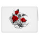 Contour, lune de croissant mécanique avec des engrenages, décoré de roses rouges avec des tiges noires spirées et feuilles sur arrière - plan blanc. Steampunk