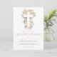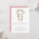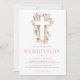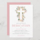 Un beau dévouement bébé pour votre fille avec une croix blanche avec de jolies fleurs roses et des feuilles verts derrière, comme point focal. Personnalisez avec vos détails en rose et gris.
